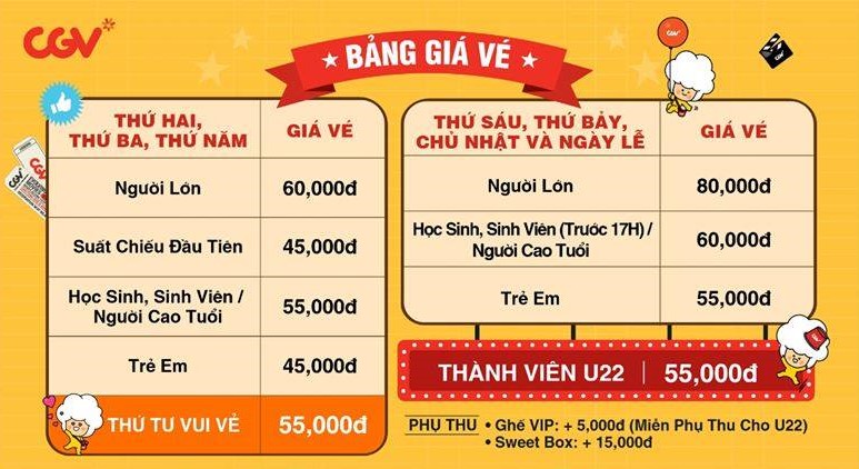 CGV có nhiều mức giá vé khác nhau cho học sinh sinh viên, đặc biệt vào các giờ thấp điểm, giá vé có thể rẻ từ 60.000 VNĐ đến 80.000 VNĐ.
